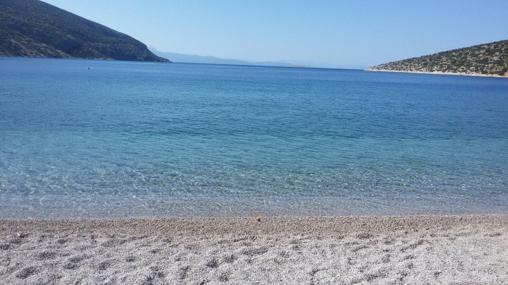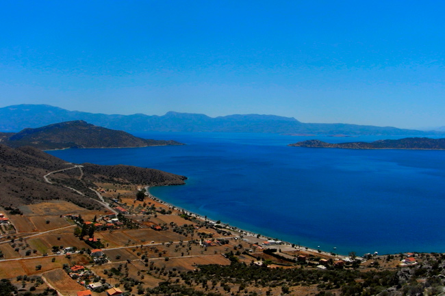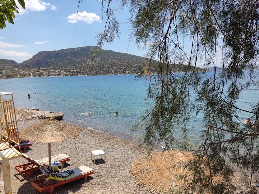 Η μεγαλύτερη από τις παραλίες της περιοχής, την οποία σπάνια «πιάνει» αέρας. Απέναντι από την παραλία υπάρχει ένα μικρό νησάκι, ο Κούβελος, στο οποίο υπάρχουν αρχαία ερείπια και έχουν βρεθεί θραύσματα αγγείων. Ακόμα πιο ανοιχτά φαίνονται μερικά ακόμα ερημονήσια, τα οποία προσφέρονται για ψάρεμα και κυνήγι.